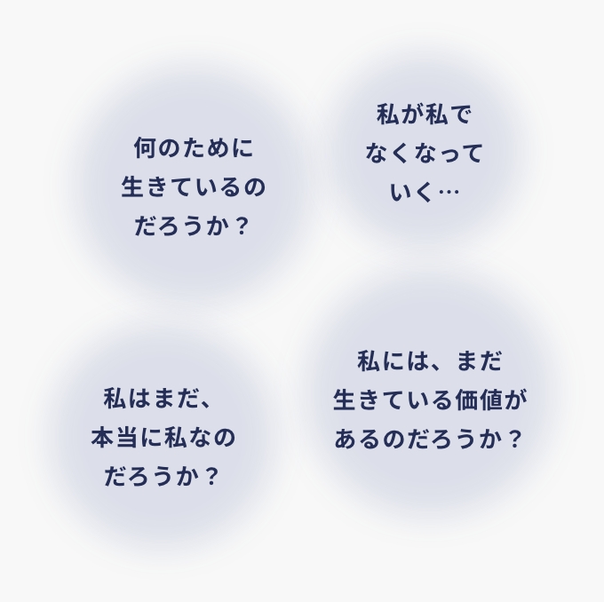 人生の最終段階において、人は様々な形で、自分自身の“尊厳”を失っていきます。今まで1人で買い物に行けていた人が、行けなくなったり、今まであたりまえにできていた入浴やお手洗いですら、できなくなったりします。自分が果たしてきた役割を失い、家族や他の人に迷惑をかけ、本当は自分でやりたいことを制限されてしまい、自尊心が崩れていきます。