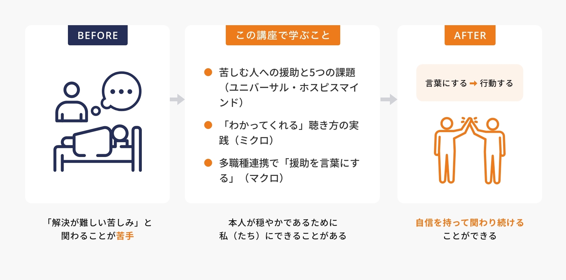 医療介護職ではなくてもご受講いただけます。これまでも、家族の介護経験者や、これからのことを考えて学んでおきたい方や、こうした活動を応援したい方など、業界業種問わずご参加いただいております。事例検討やロールプレイを行う際、不安のある方はスタッフがサポートいたしますのでお声がけください。意思決定支援など、ある程度専門的な分野を含むものであることはあらかじめご了承ください。